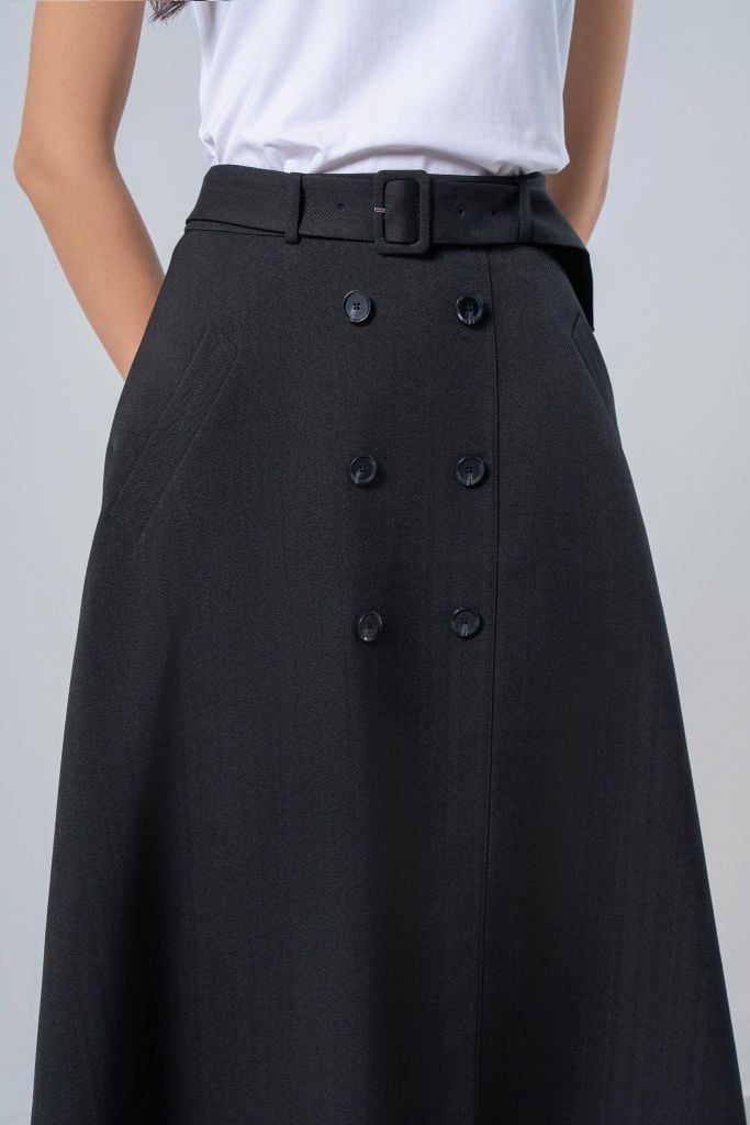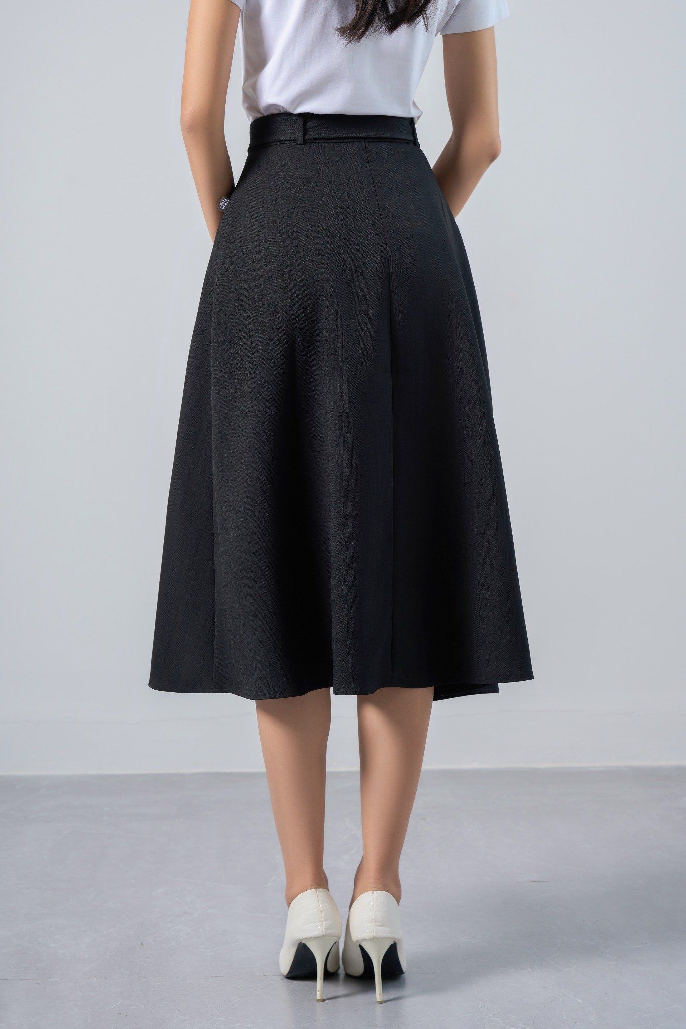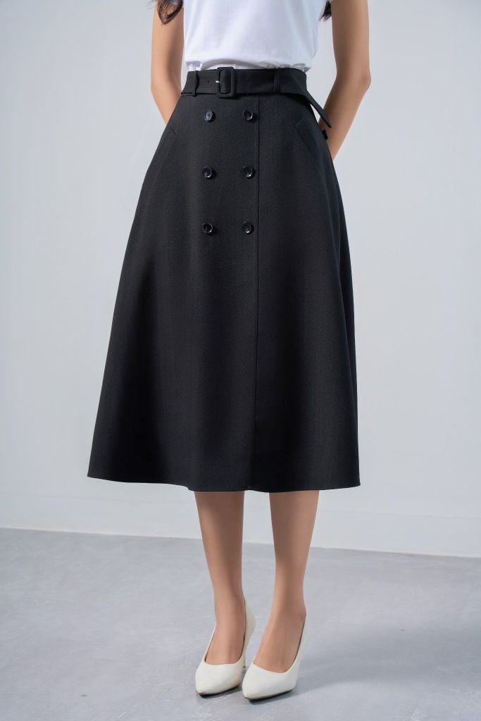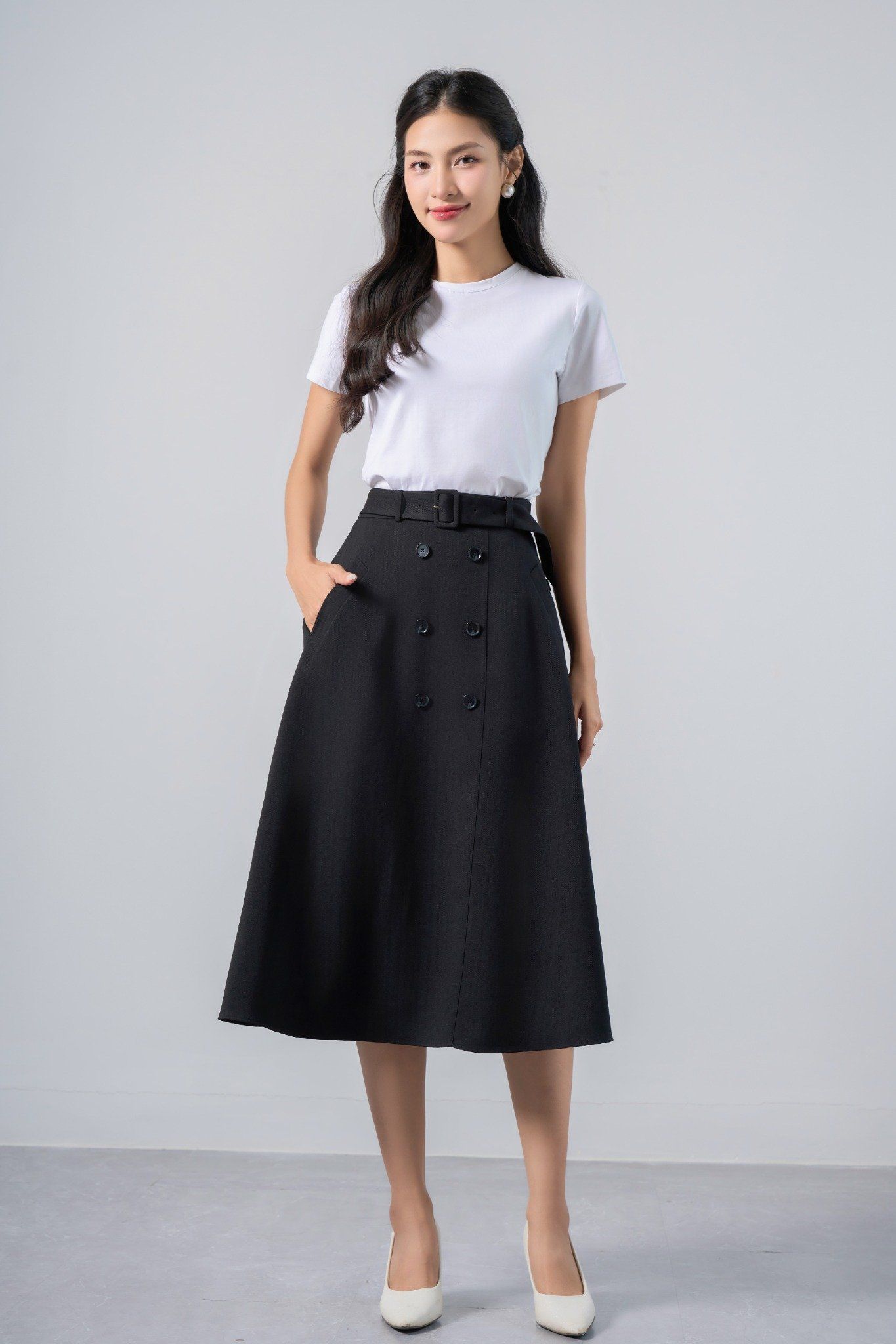 - Chân váy dáng xoè nhẹ nhàng với thiết kế 2 hàng cúc cùng chất liệu vải hoạ tiết kẻ chìm tạo nên sự trẻ trung, năng động cho các quý cô.