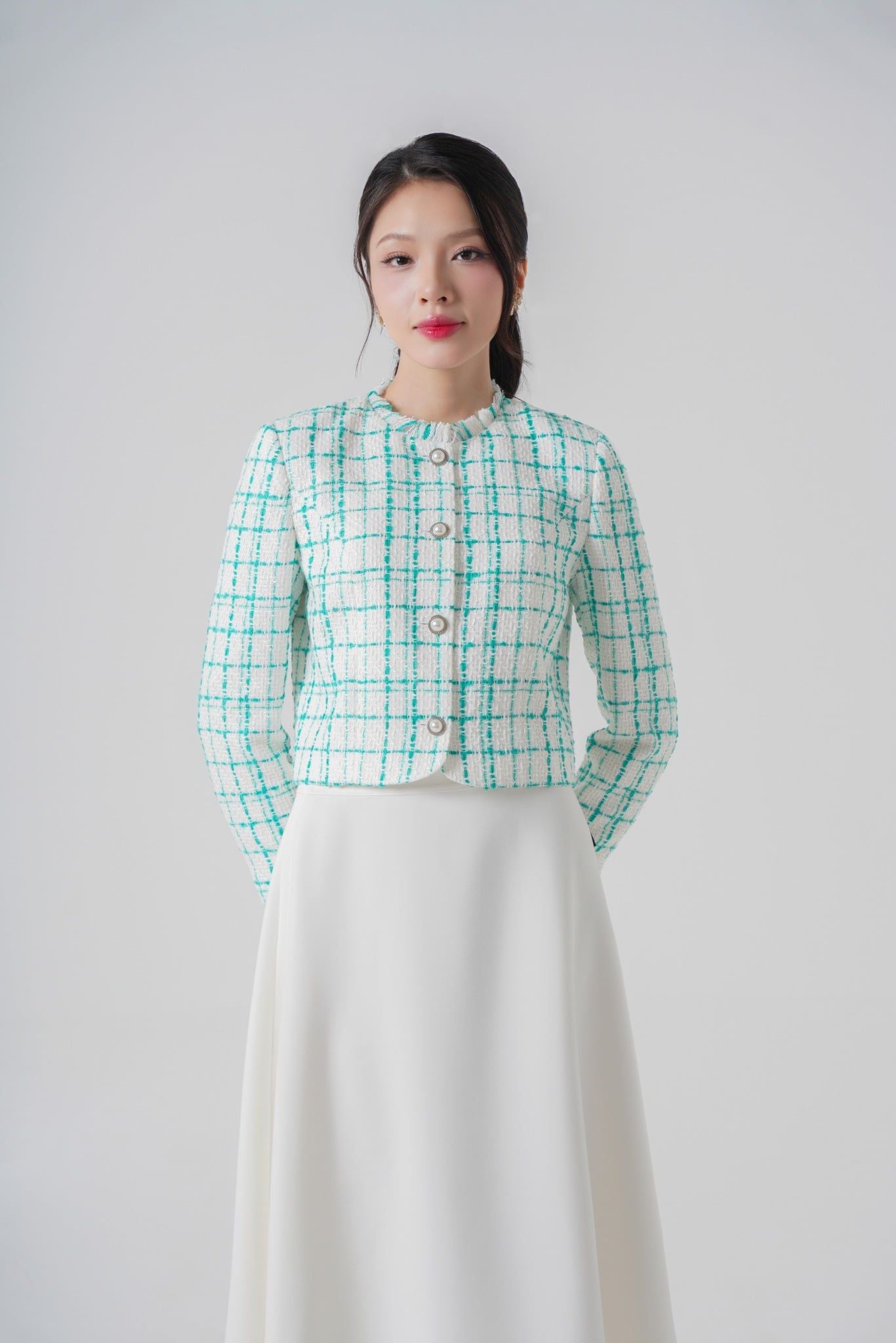 | Cảm hứng thiết kế | Lấy cảm hứng từ phong cách quý cô Paris cổ điển kết hợp tinh thần nữ tính hiện đại. Chất liệu tweed cao cấp cùng phom jacket lửng mang hơi thở thanh lịch, nhẹ nhàng nhưng vẫn nổi bật. | |