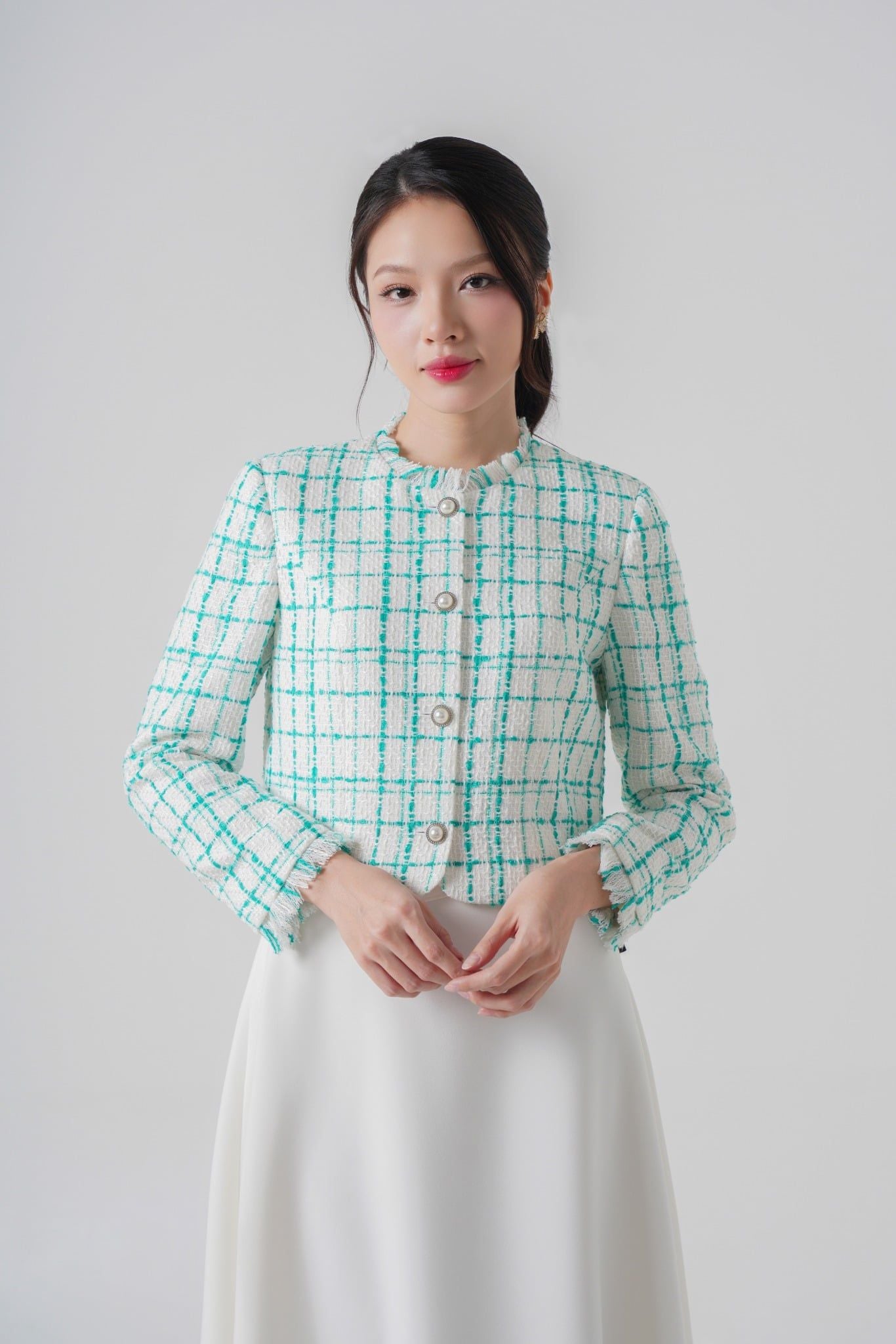 | Điểm khác biệt | Phom lửng chuẩn tỉ lệ, giúp hack chiều cao khi phối cùng chân váy/quần cạp cao. Viền tua nhẹ tinh tế, nữ tính Nút kim loại đính ngọc trai tạo điểm nhấn hoàn hảo | |