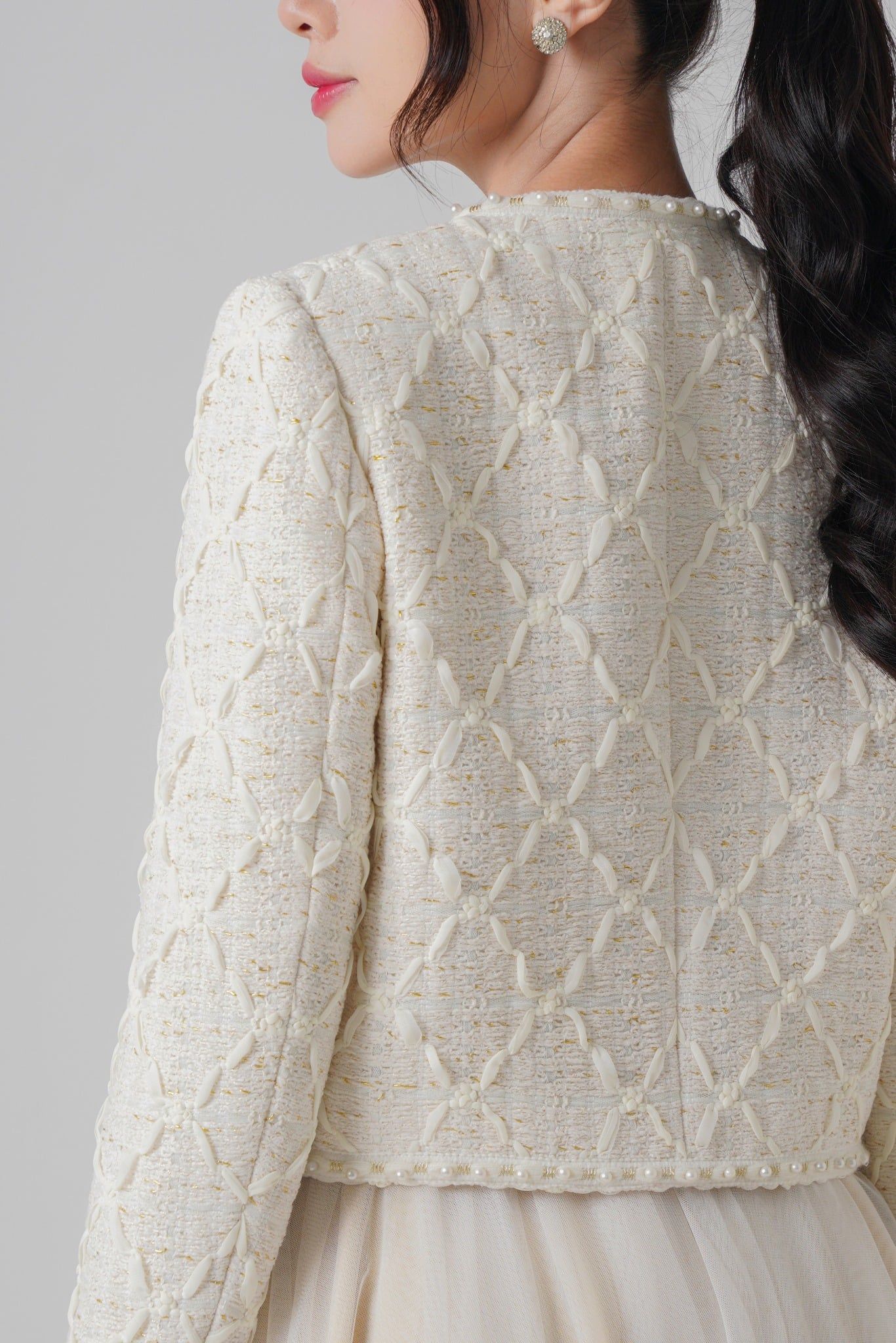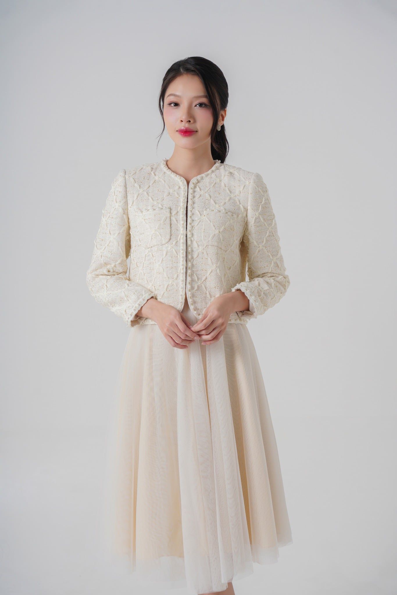 | Cảm hứng thiết kế | Lấy cảm hứng từ phong cách cổ điển Pháp, kết hợp ren dệt nổi với chi tiết viền ngọc trai tạo hiệu ứng sang trọng và tinh tế. |