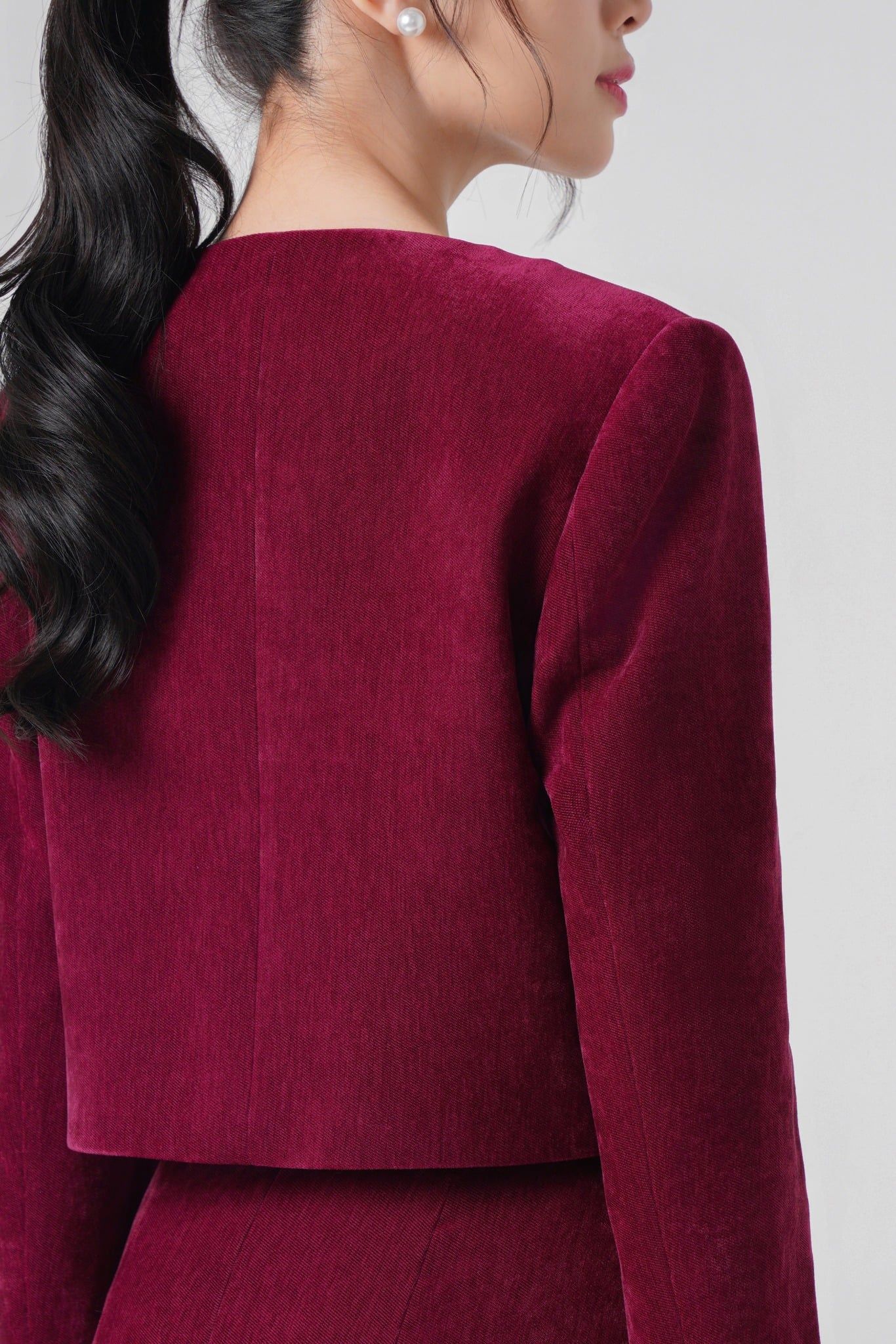 | Chi tiết cắt may nổi bật | Chất liệu nhung cao cấp với đường may sắc nét tinh tế. Vai dựng phom nhẹ,đường may tối giản để tôn chất liệu. Kỹ thuật đính kết tinh sảo. | |