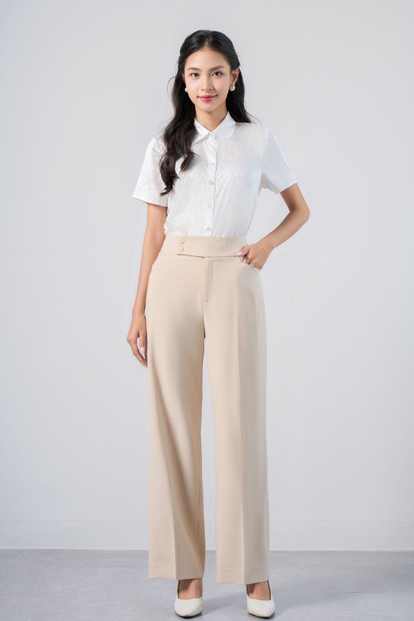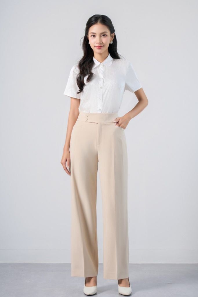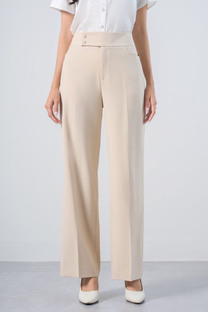 - Quần công sở dáng xuông tôn lên vóc dáng quý cô văn phòng. Cạp cao, bản to trẻ trung và khỏe khoắn.