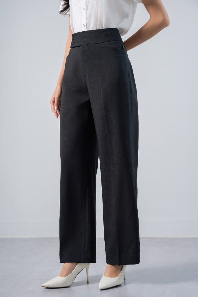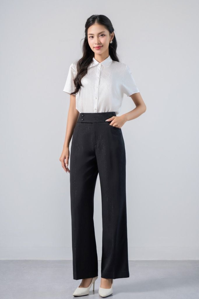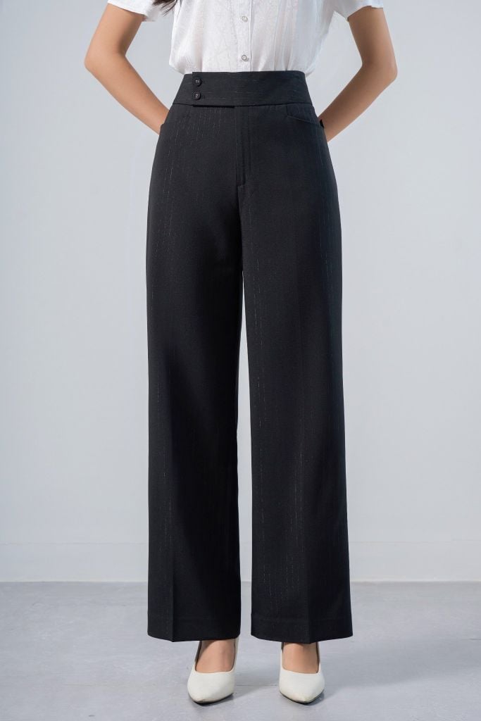 - Quần công sở dáng xuông tôn lên vóc dáng quý cô văn phòng. Cạp cao, bản to trẻ trung và khỏe khoắn.