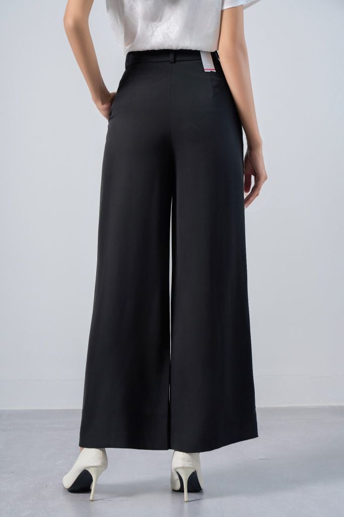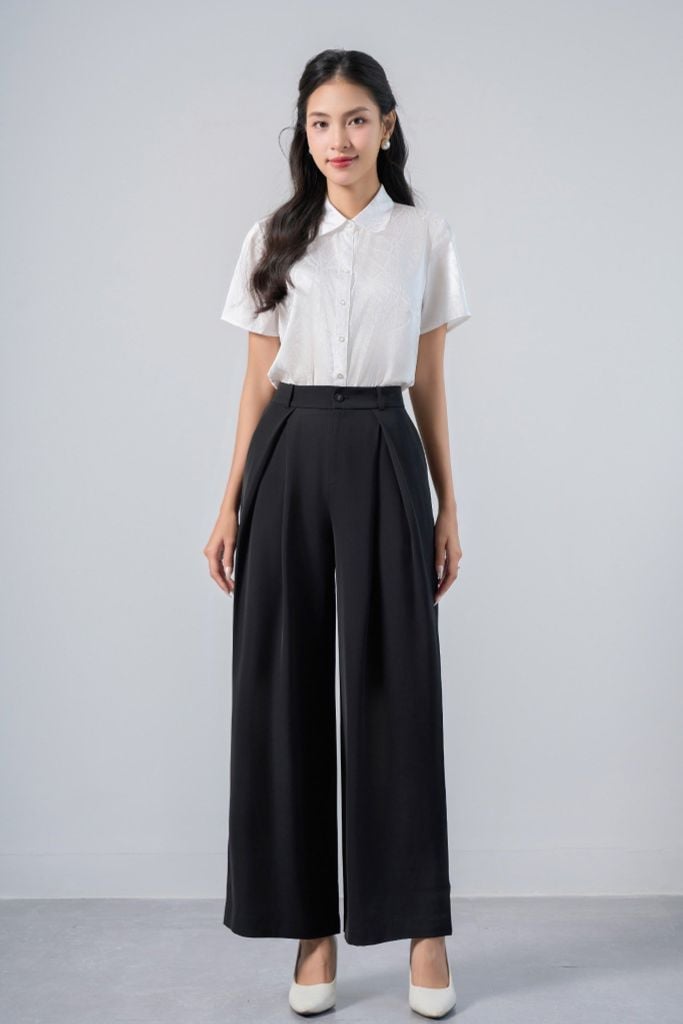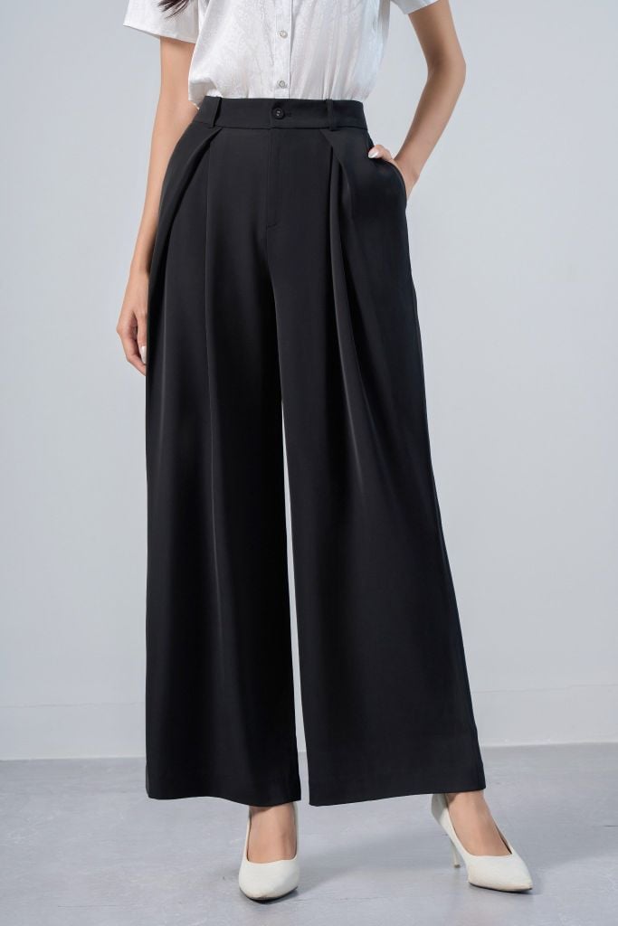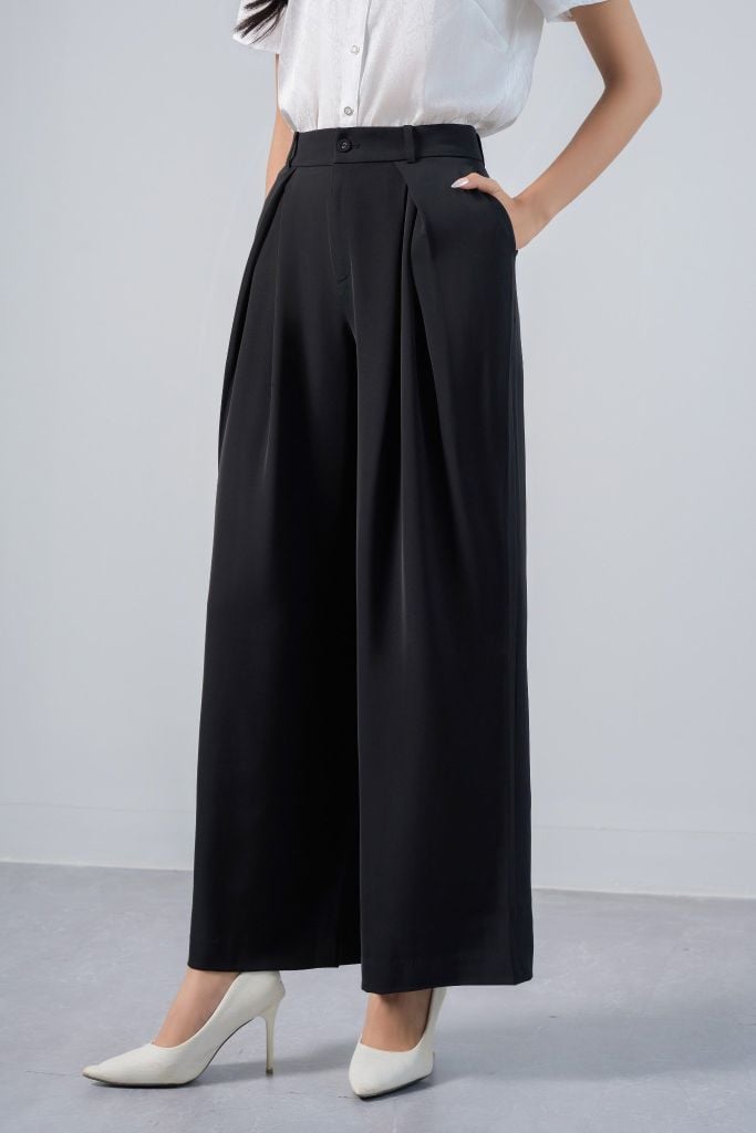 - Quần suông ống rộng với thiết kế 2 ly xếp chéo mới lạ, thêm phong cách cá tính cho bộ đồ công sở thêm nổi bật.