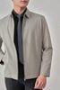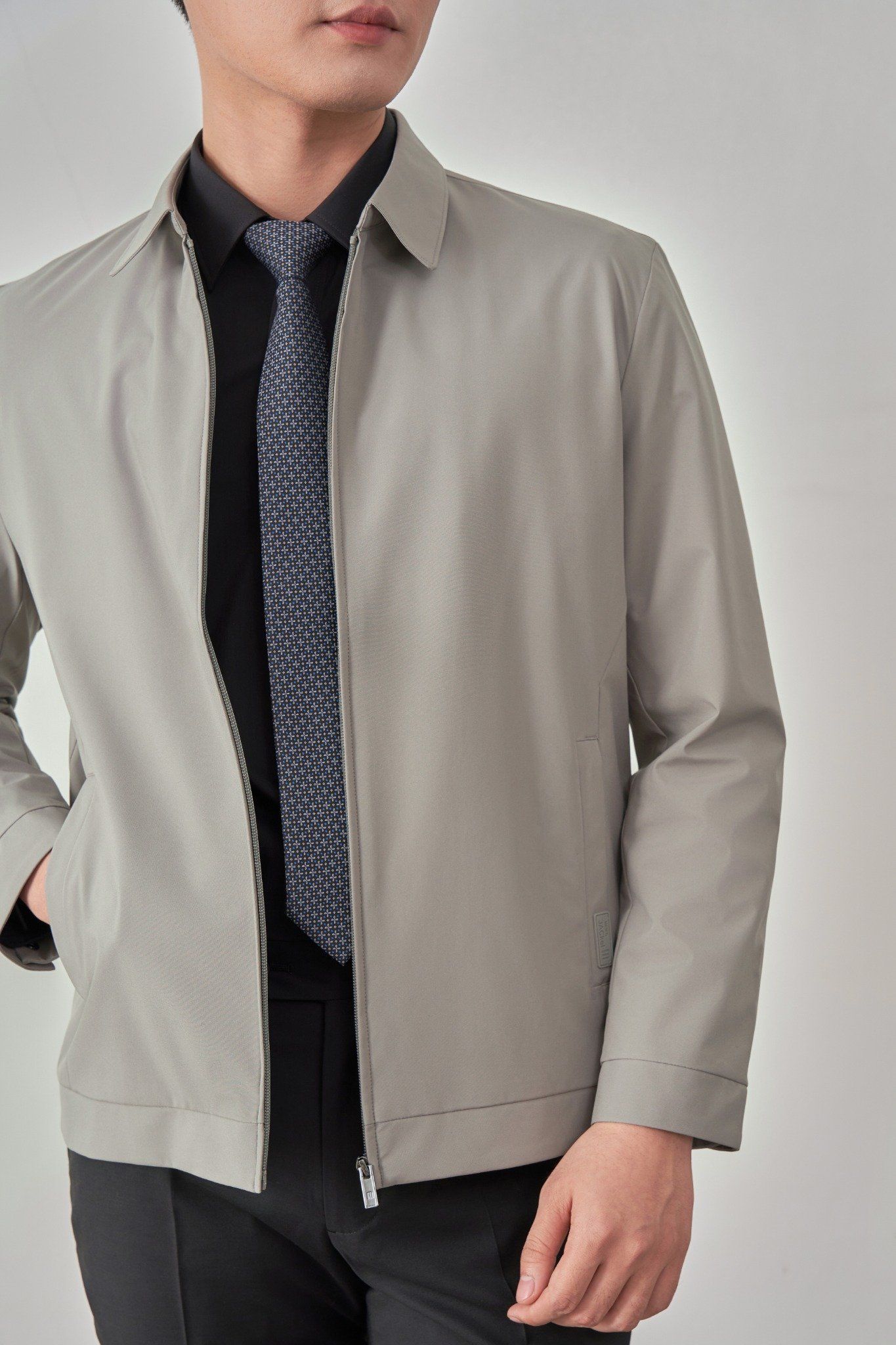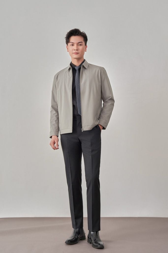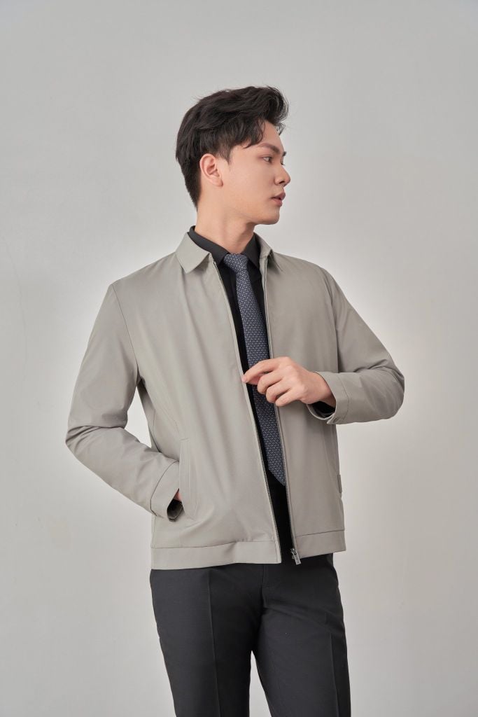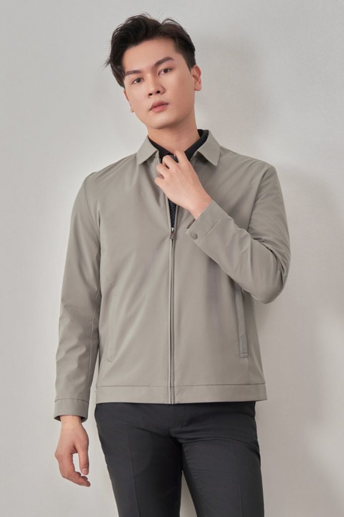 - Sản phẩm áo khoác có cổ bẻ cứng cáp, cổ tay cài khuy và túi áo ngoài có khóa kéo
