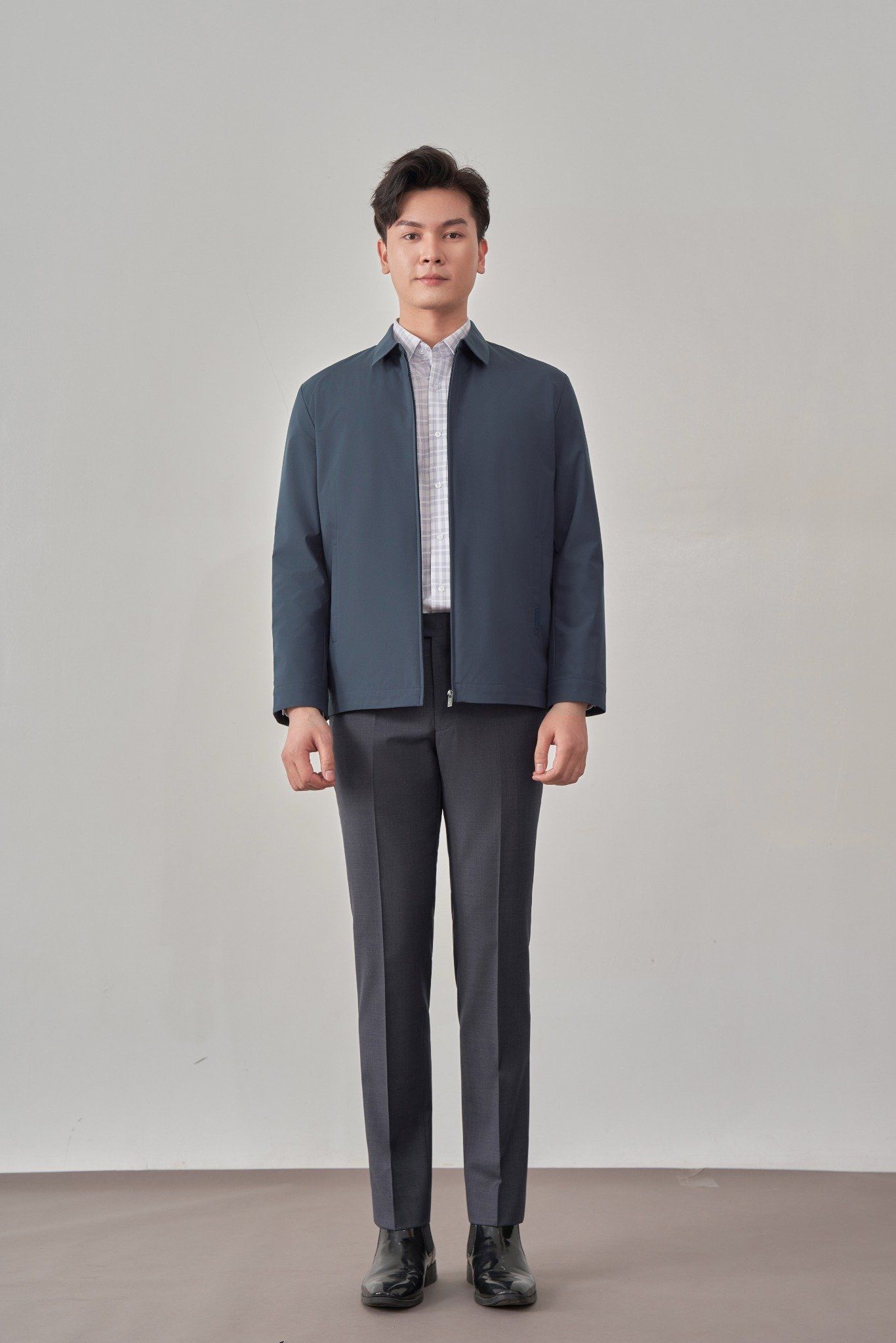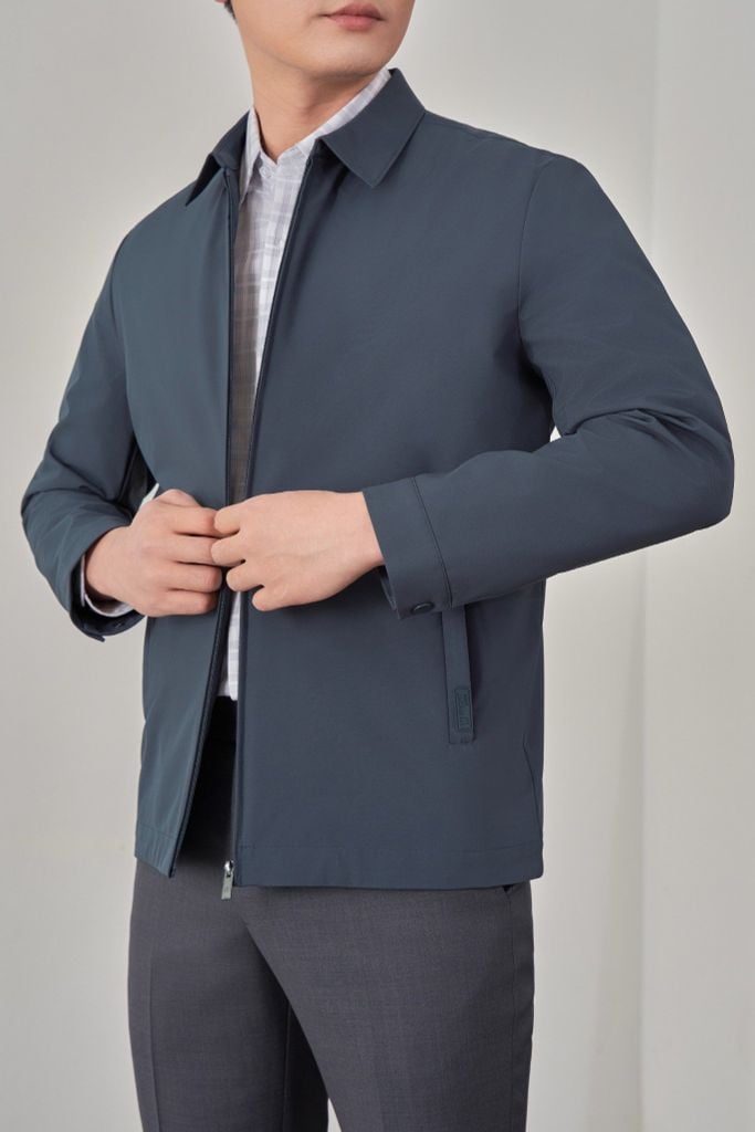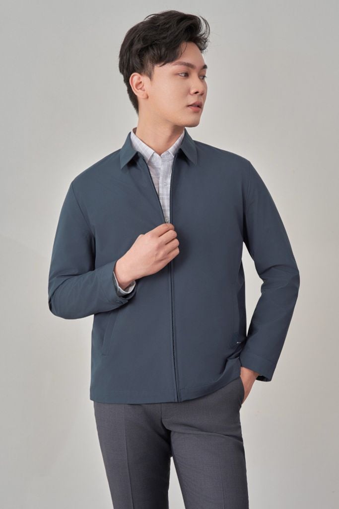 - Sản phẩm áo khoác có cổ bẻ cứng cáp, cổ tay cài khuy và túi áo ngoài có khóa kéo