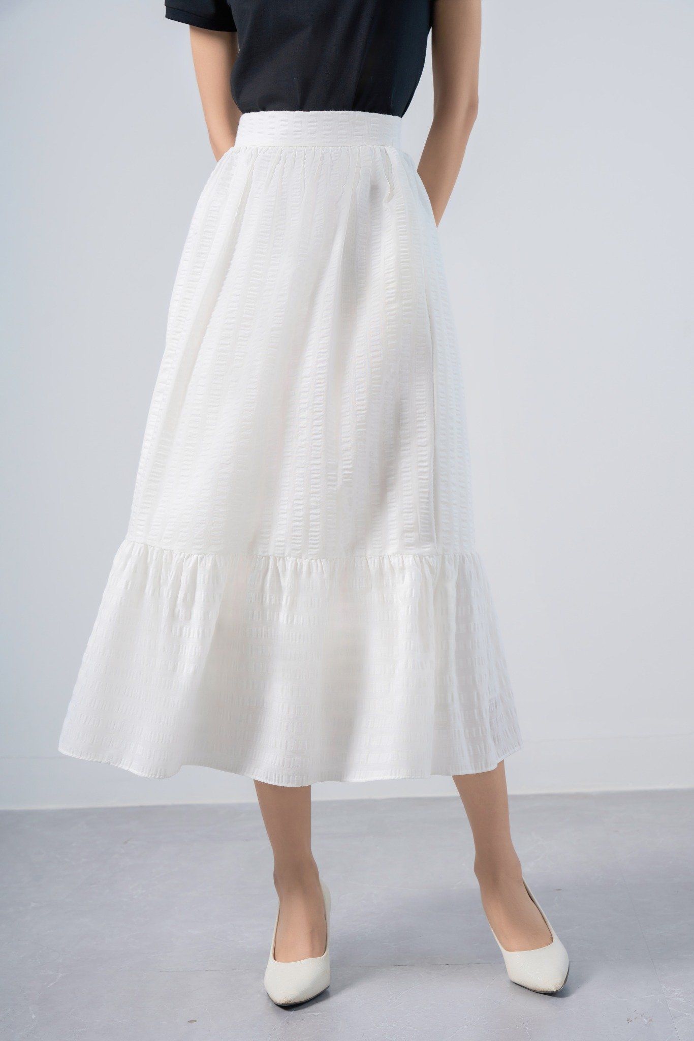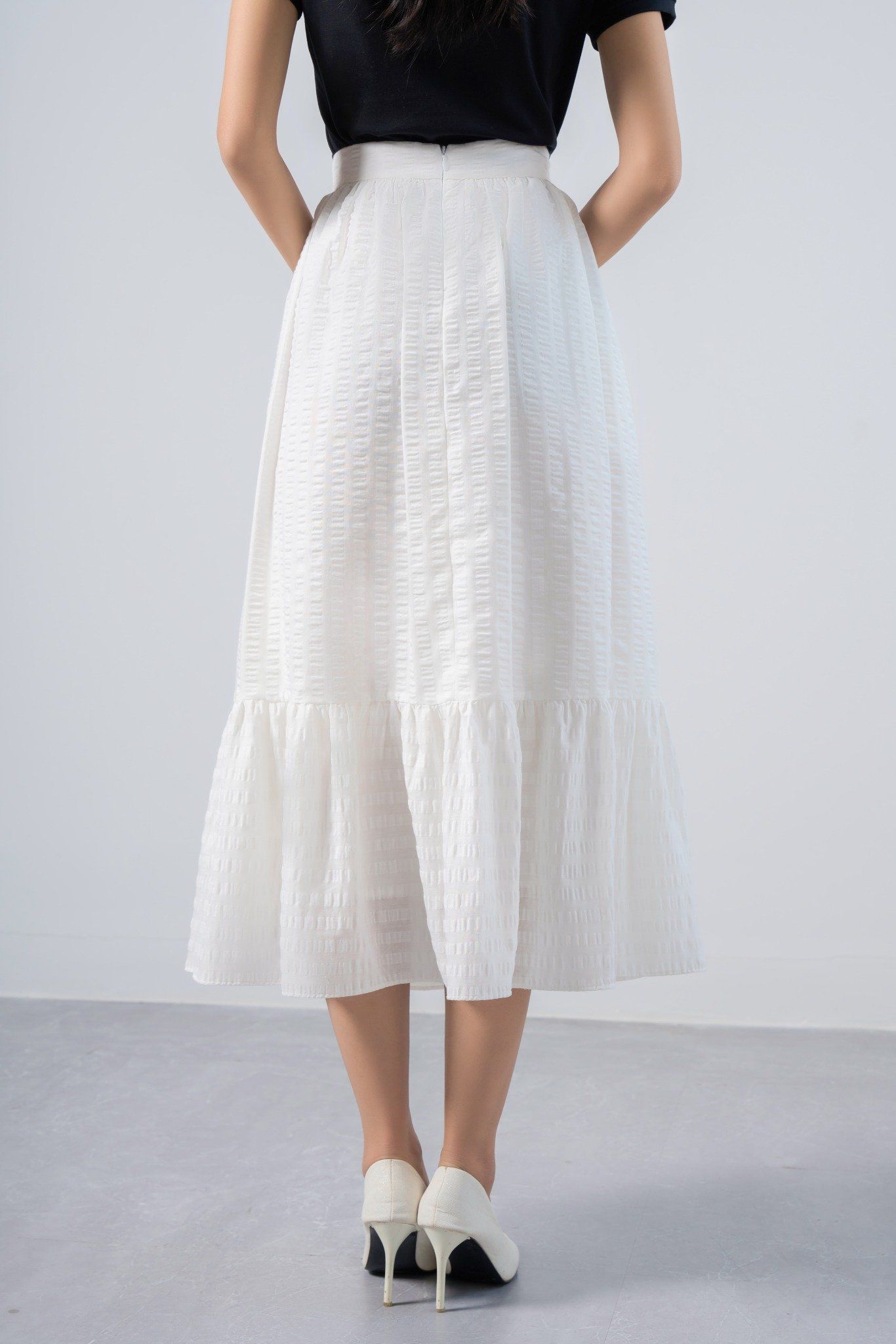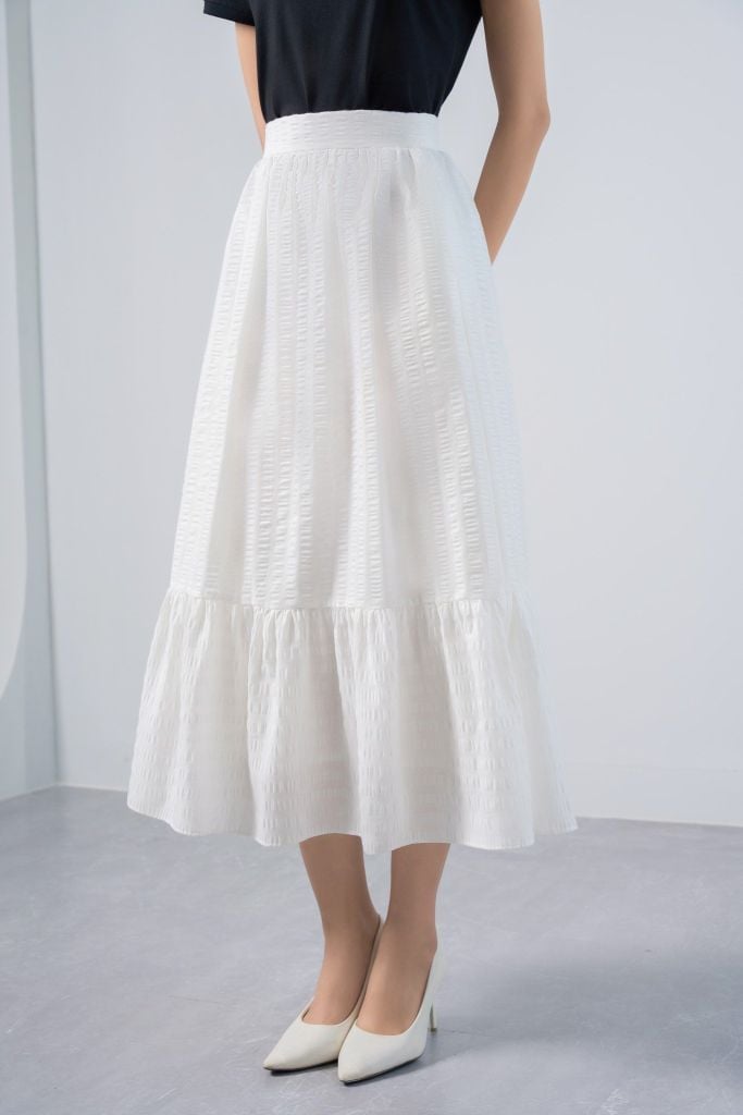 • Chân váy có vân kẻ, phần nhún tạo độ bồng bềnh cho sản phẩm khi mặc lên