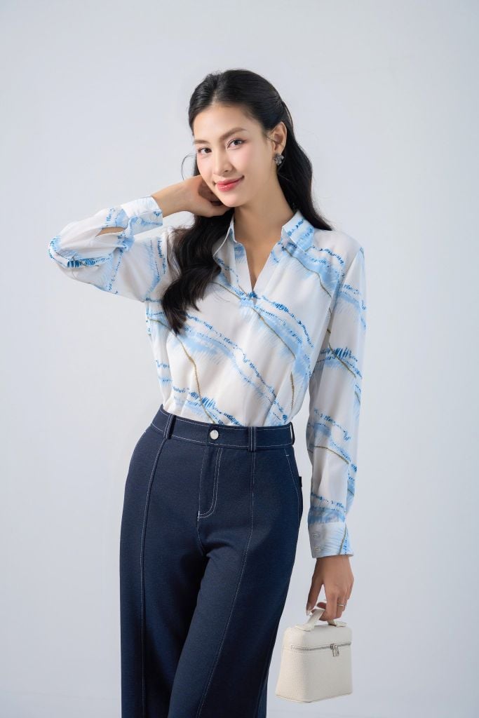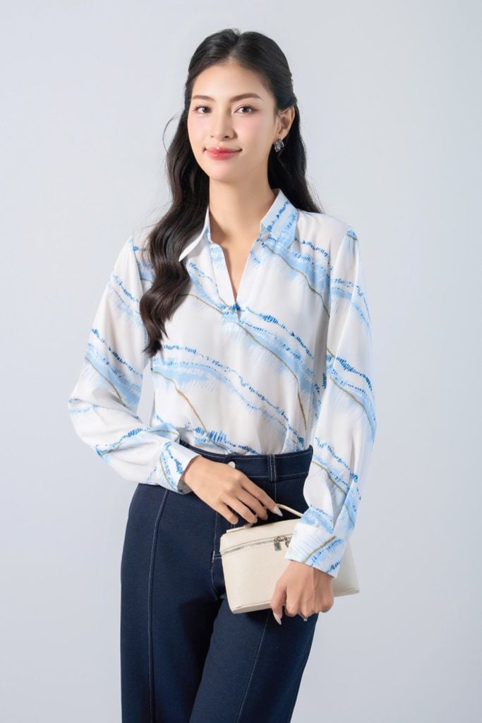 - Áo sơ mi dài tay mix cùng chân váy công sở cùng tone họa tiết hoa văn để tôn được sản phẩm
