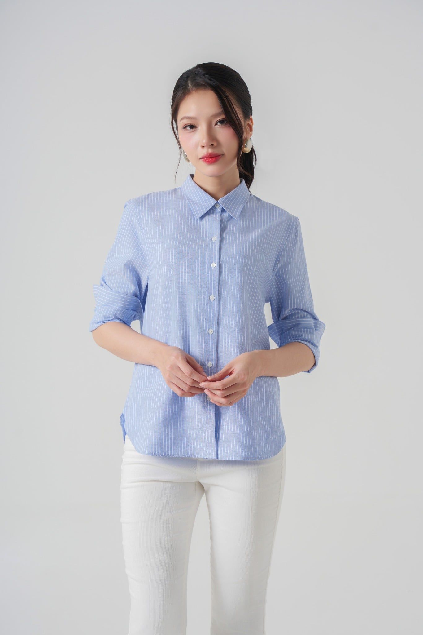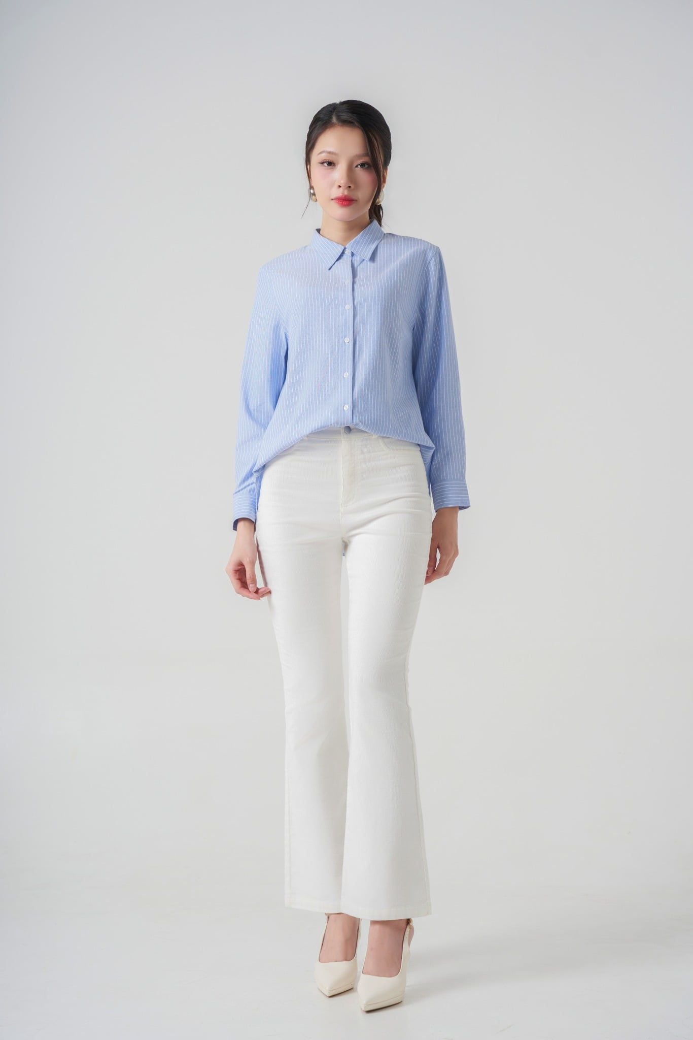 Áo sơ mi kẻ xanh pastel + quần âu trắng/kem dáng đứng. Kết hợp giày cao gót mũi nhọn, túi sách